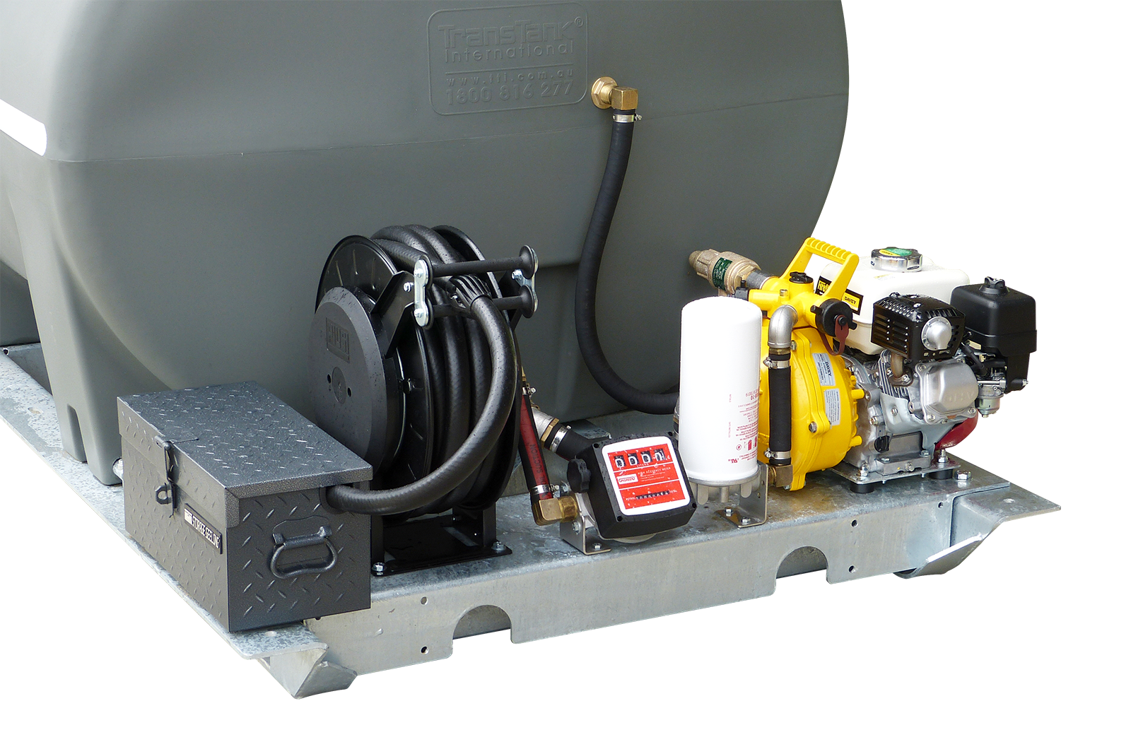 • Available with 60L/min Fluid 12v pump, 4m battery cables and 6m delivery hose with auto-stop nozzle (Optional)